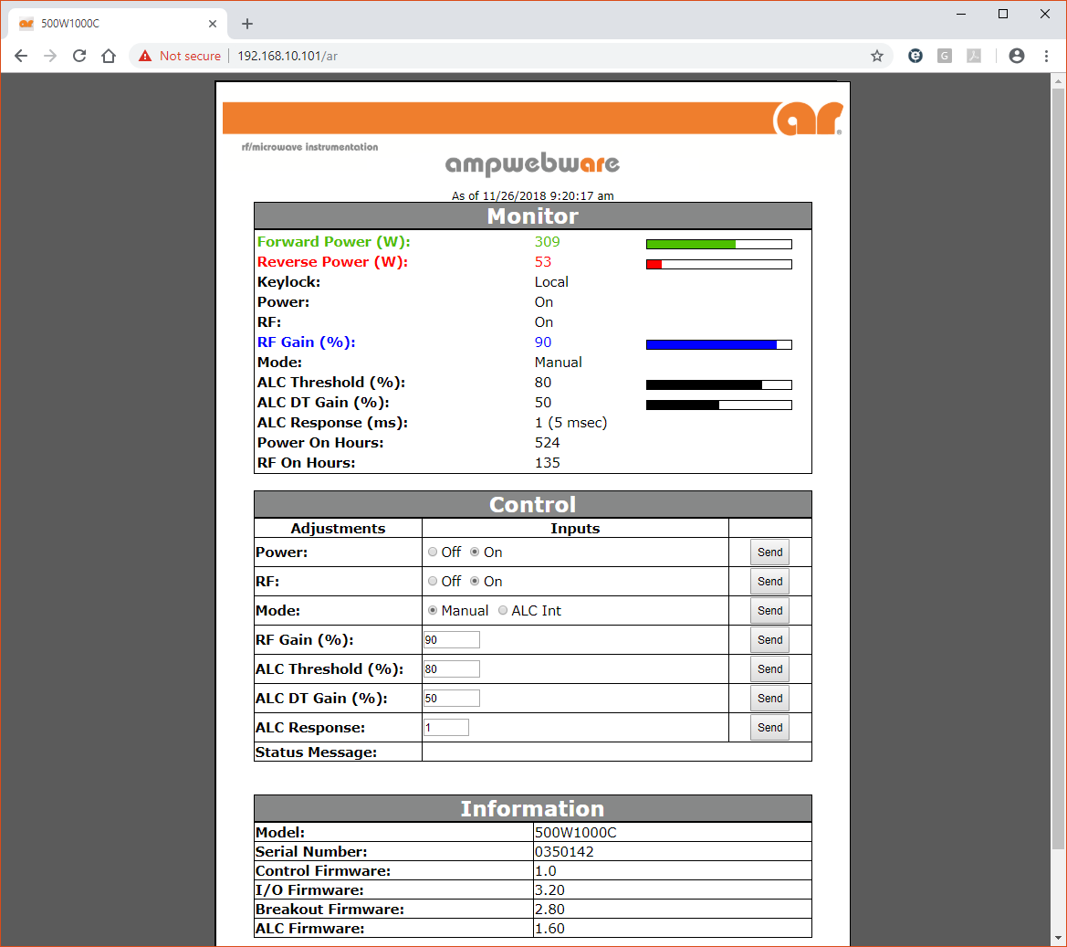 As technology evolves, electronic devices continue to take on a more mobile and virtual nature. While RF and microwave amplifiers themselves may never become truly ‘mobile’, the way we control them can be. AR’s ampwebwARe gives you the capability to monitor and control your amplifier remotely without needing any software of your own. If the user switches to ‘remote’, the front panel locks and the user can control the amplifier from an embedded webpage. Through this webpage, you can look at the power the amplifier is generating, the hours of operation, and manage all the controls remotely that you would normally do from the front panel of the amplifier.