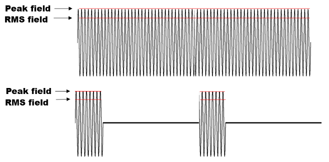 When working with pulsed signals, signal levels are often referred to as the ‘peak’ level; however, this would more accurately be described as the ‘RMS level of the pulse.’ The instantaneous peak of an RF field can be calculated in the same manner as a peak value can be calculated of any cyclical signal, although this peak value is not used in EMC test standards.