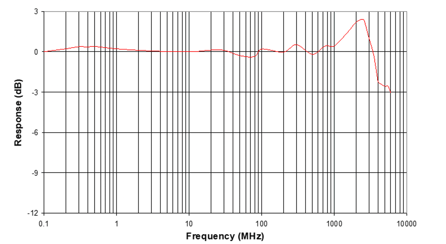 The frequency response of a probe is one of the first probe specifications to consider and is the frequency range over which the probe’s performance is defined. Since no probe can provide a completely flat response across the entire frequency range, this spec is accompanied by a tolerance figure, generally provided as a ±dB allowable variation band. An example of a frequency response curve is shown in Figure 1. If the probe does not cover the entire frequency range of the test application, multiple probes may be required.