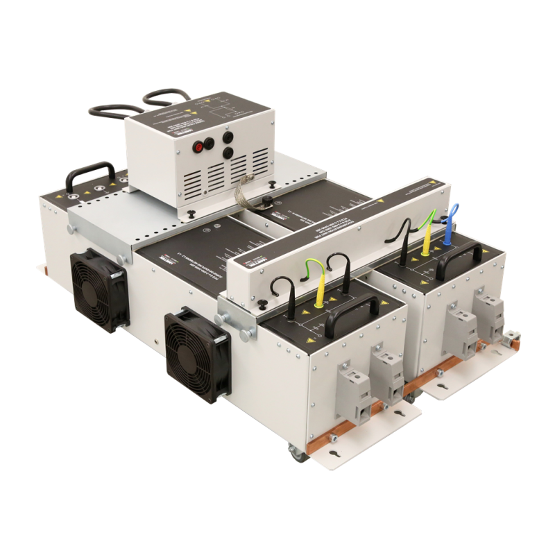 Coupling/decoupling network for surge pulses on high voltage supply lines up to 3 * 690 V AC, 1.000 V DC, models for 100 and 200 A available. Pulses are coupled manually.