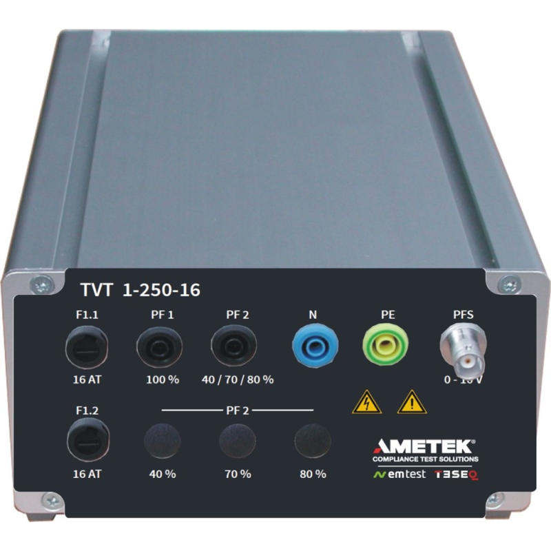 The TVT 1-250-xx series of tapped transformer are used to simulate power supply failures such as voltage dips and interruptions providing taps with 40 %, 70 %, 80 % and a direct output with 100 % of the nominal mains supply voltage. Automatic tap selection by means of the 0-10 V DC signal provided by the test generator, max 16 A.