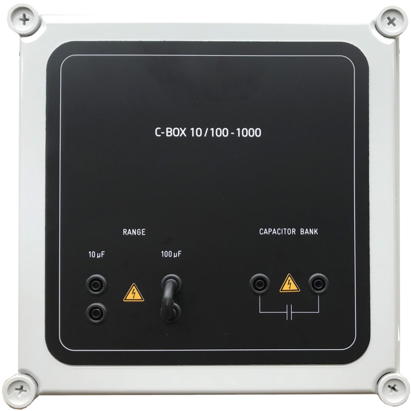 The C-Box 10/100-1000 is used to bypass the power source during ripple testing. It comes in a compact box containing two capacitances of 10 and 100 uF. The value can be selected by setting the jumper on the front panel of the box.