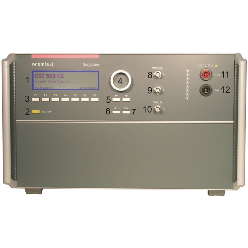 CSS 500N2 is an intelligent solution offering exactly what you need for full-compliant immunity tests against transient current surge phenomena with the wave shape of 8/20 us. The distinct operation features, convenient DUT connection facilities, a clearly arranged menu structure and display philosophy as well as the pre-programmed standard test routines make testing easy, reliable and safe.
