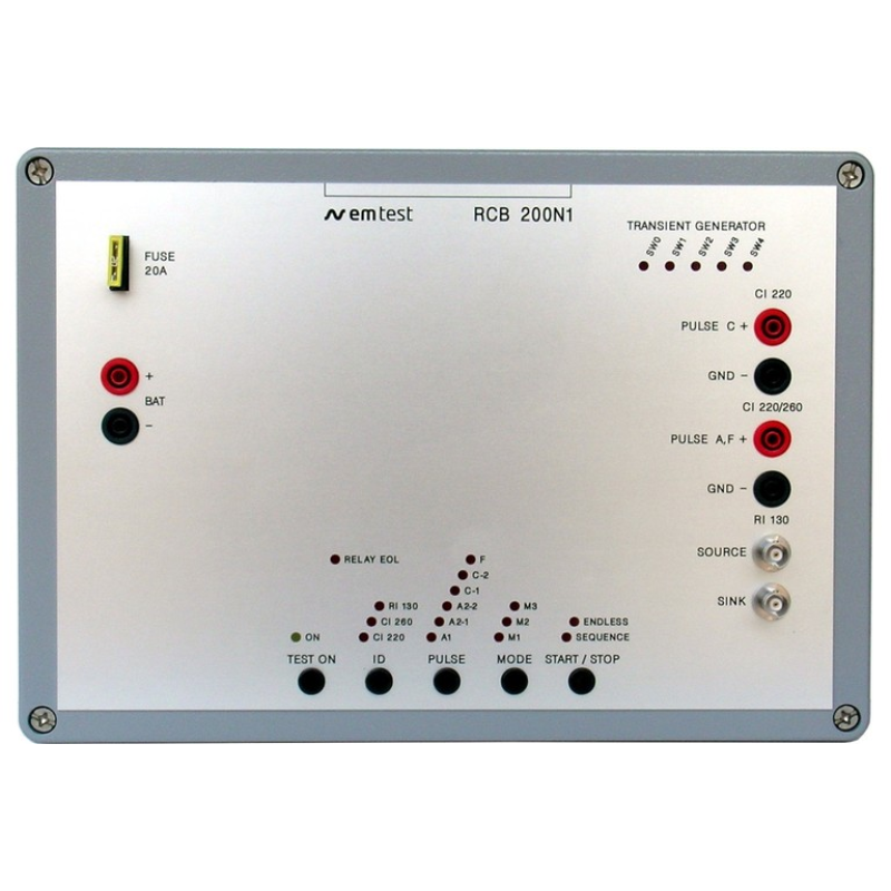 The EM TEST RCB 200N1 transient generator meets the requirements set out by the FORD FMC1278 and EMC-CS-2009.1 standard document. It is built using the components outlined in Figure F-1 to generate pulses such as CI 220 A1, A2-1, A2-2, C-1 and C-2, CI 260 F and RI 130 A2-1 and A2-2 for which the RCB 200N1 is built into a metal housing. For RI 130 testing the RCB 200N1 offers BNC-type coaxial outputs to connect the specified test fixture needed for this particular test.