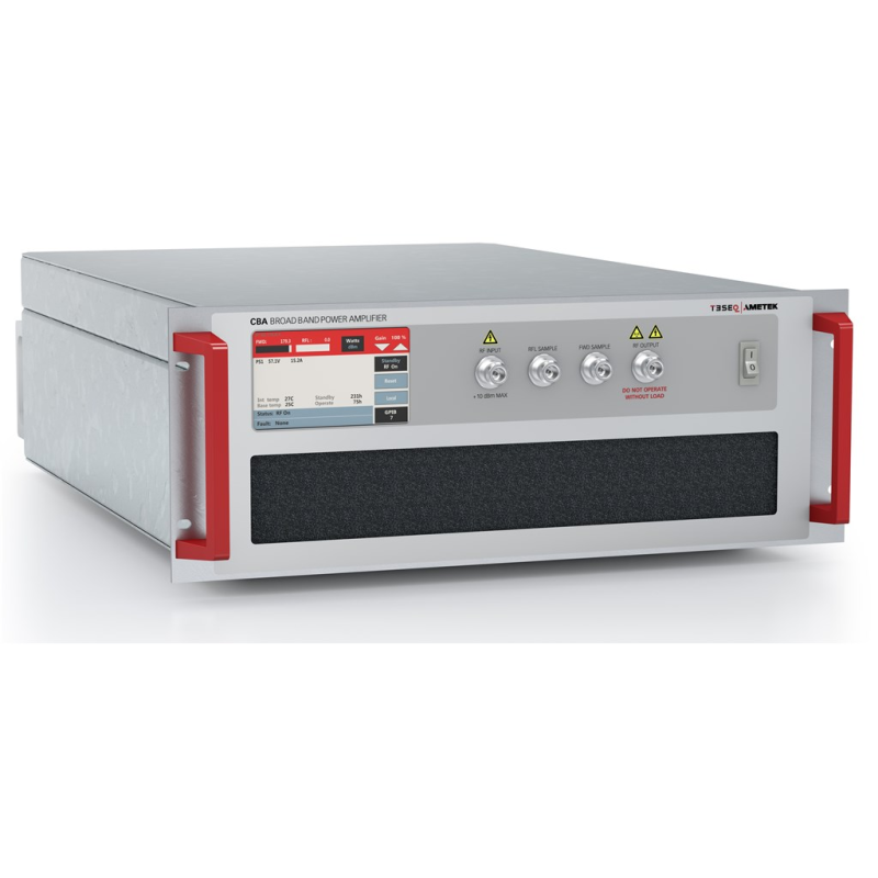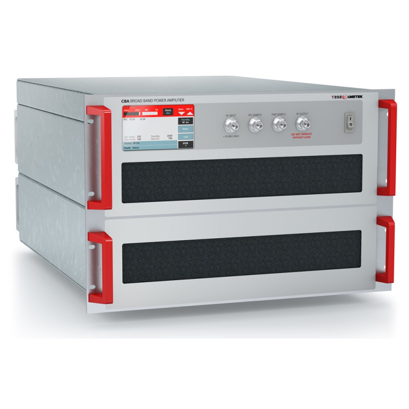 A high power density, design has allowed us to produce a dual-band series with power levels from 30 to 50 watts P1dB, 20 MHz to 6 GHz solid-state amplifier in either a compact 4U or 7U package. This amplifier series is not only ideal for RF immunity testing to standards such as ISO11452-9 but also many 5G infostructure component tests. The touch screen colour display gives an immediate visual indication of the operating status of the amplifier and access to diagnostic information such as gate current and heatsink temperature. The fan speed adjusts depending on the heatsink temperature thus ensuring the minimum audio noise level possible in the operating environment. The dual directional calibrated coupler provides a quick and easy way to monitor forward and reflected power with any power meter. Input overdrive protection prevents damage to the input devices due to accidental high input power. Multiple remote interfaces are available as standard including USB, GPIB, RS232, and Ethernet. Amplifier gain can be controlled either remotely through one of the available interfaces or via the front panel touch screen.
