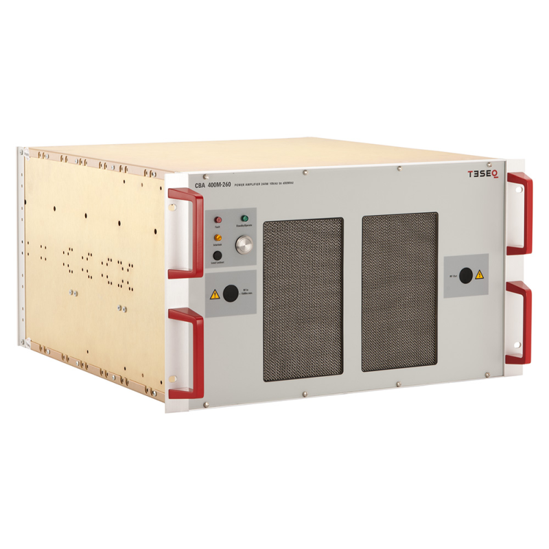 Designed specifically for automotive, military and aerospace BCI EMC testing, this mismatch tolerant Class A amplifier series delivers power continuously into the varying match typically associated with this type of testing. The Class A design ensures a high reliability, low distortion linear performance across the frequency range. This design also ensures that the amplifier will continue to operate at full power even when presented with an open or short circuit at its output. These units are powered from a switched mode power supply for high efficiency, high power factor and wide voltage range operation. Air-cooled with integral fans, and protected against faulty cooling by excess temperature sensing. A safety interlock connector is provided, which the user can short circuit to ground, to put the amplifi er into standby mode. Front panel indicators are provided to indicate over-temperature and rf interlock operation.