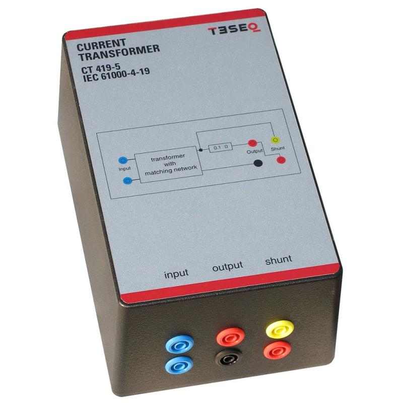 IEC/EN 61000-4-19 specifies the differential current test in the frequency range 2 kHz to 150 kHz. Teseq offers with CT 419-5 a 1:1 transformer for testing EUTs like electricity meters. The CT 419-5 is fully compliant with the requirements of the standard and provides a simple and reliable method of injecting differential mode current into the equipment under test (EUT).