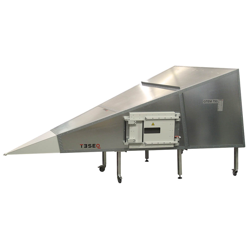 A GTEM (Gigahertz Transverse Electro Magnetic) cell is a test site for efficiently performing both radiated immunity and emissions testing in a single, controllable and shielded environment. Compared to other test sites, GTEM testing is faster with high accuracy and excellent reproducibility. In principle, the GTEM cell is a coaxial line expanding pyramidally and having an impedance of 50 Ω. At its end, the line is terminated by a combination of termination resistors and RF absorbers designed and constructed to match the above mentioned impedance. The GTEM 750 has a maximum septum height of 750 mm and is suitable for emissions and immunity testing.