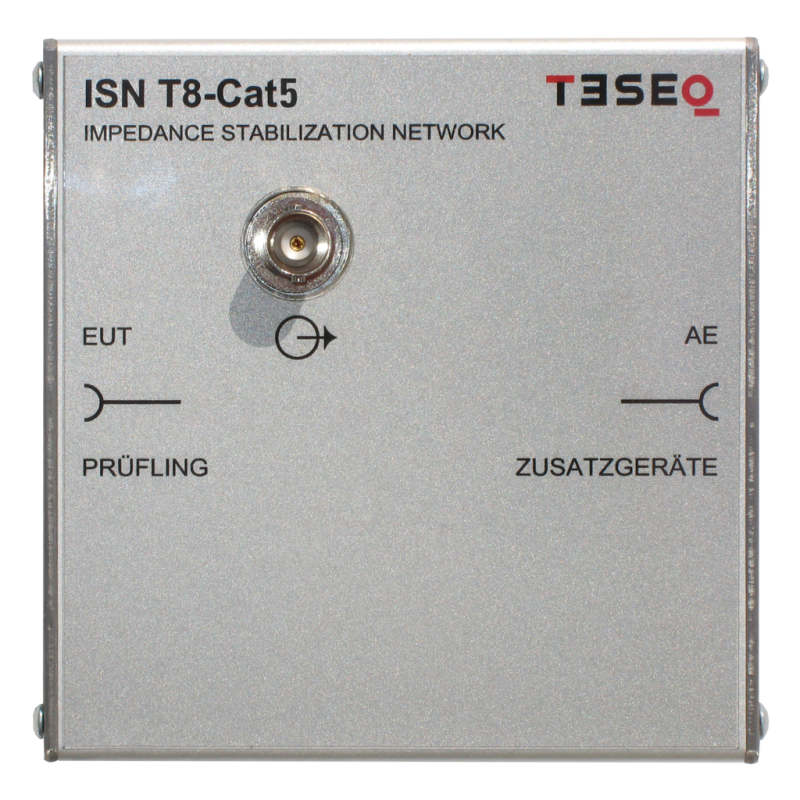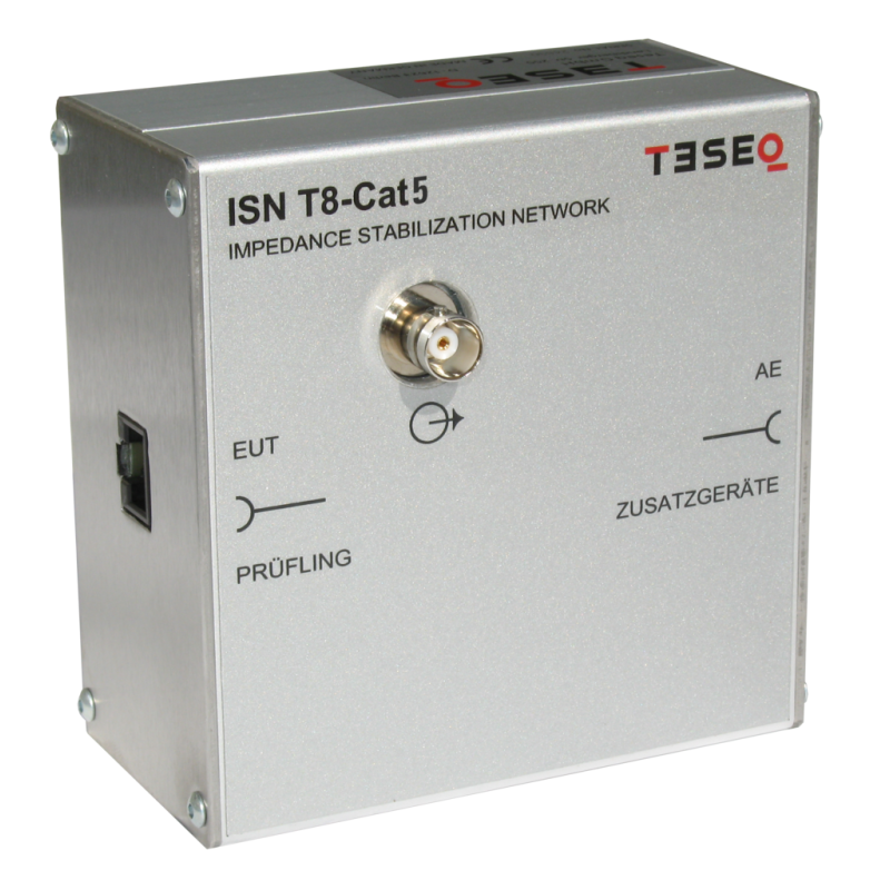 The ISN T8-Cat5 is engineered for electromagnetic compatibility (EMC) testing on information technology equipment (ITE) using Cat 5 cables. It is placed between the equipment under test (EUT) and auxiliary equipment, providing precise common-mode termination impedance required for accurate measurement of conducted emissions. The ISN simulates the longitudinal conversion loss (LCL) of the telecommunications line, mimicking real-world conditions. With the ability to support up to four unscreened single balanced pairs, the ISN T8-Cat5 meets the requirements of CISPR 22 and CISPR 32 for emission testing. Additionally, it functions as a coupling-decoupling network (CDN) for immunity testing in accordance with IEC/EN 61000-4-6, supporting frequencies up to 80 MHz, making it a versatile solution for both emission and immunity assessments.