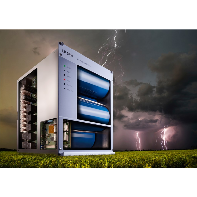 Alternators produce a high-energy (load dump) pulse on a vehicle’s power system when the battery is disconnected. The LD 5550 simulates the corresponding pulse 5 specified by numerous standards, and the clamped load dump pulse 5b. Some vehicle manufacturers have expanded upon these specifications – in most cases by making them more stringent. This generator takes this into account.