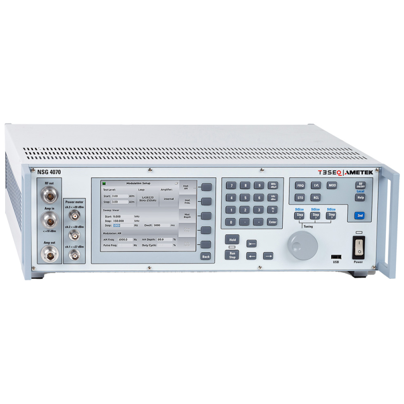 The NSG 4070C-LFCP is a universal device for standard-compliant and development-accompanying EMC immunity tests in the application area of magnetic field testing in the close proximity according to IEC / EN 61000-4-39 and IEC / EN 60601-1-2. The NSG 4070C-LFCP integrates signal generator, directional coupler, power amplifier, power meter and EUT monitoring interfaces. The NSG 4070C-LFCP can be operated quickly, conveniently and easily via the front panel as a free-standing device. Test and measurement data can be conveniently transferred for documentation purposes via a USB stick. The NSG 4070C-LFCP can be remote controlled via LAN, electrical or optical RS232 as well as USB.