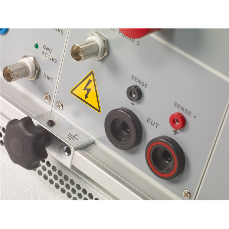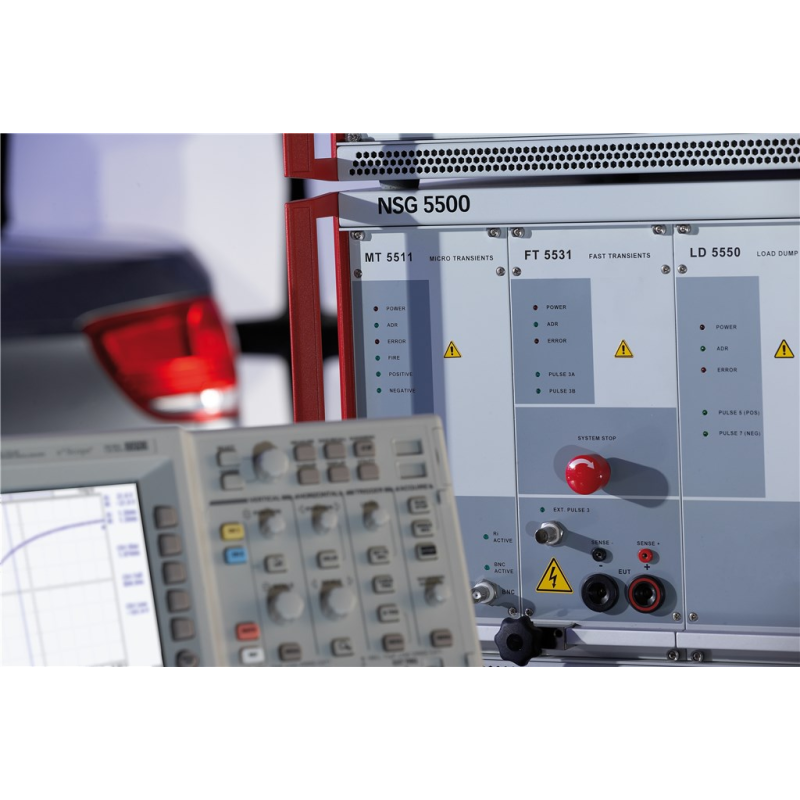 NSG 5500 system. This compact mainframe houses the common system components and accommodates the standard pulse generators. All testing is available from one output connector. An electronic switch to connect and disconnect the battery supply is in-corporated in the NSG 5500. Additional inputs and outputs are located on the rear panel for test execution control purposes and the monitoring of error signals, oscilloscope triggers, gate start/stop commands, etc. Overall control is via a PC running AutoStar™ under Windows.
